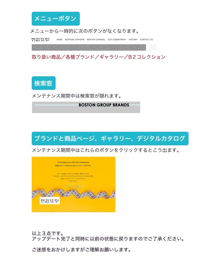 2022.12.19ホームページ メンテナンス のお知らせ 平素は弊社ホームページをご利用いただきまして、誠にありがとうございます。 この度 2023年ブランド商品上代変更に伴い、 サイトメンテナンスを下記の通り実施させていただく事となりました。 皆様には大変ご不便をおかけします事をお詫び申し上げますとともに、 何卒ご理解を賜わりますよう、よろしくお願い申し上げます。 ■サイトメンテナンス期間 2022年12月29日(木)〜2023年1月3日(火) *メンテナンス期間中は、右記仕様となります。 < 前へ 次へ >